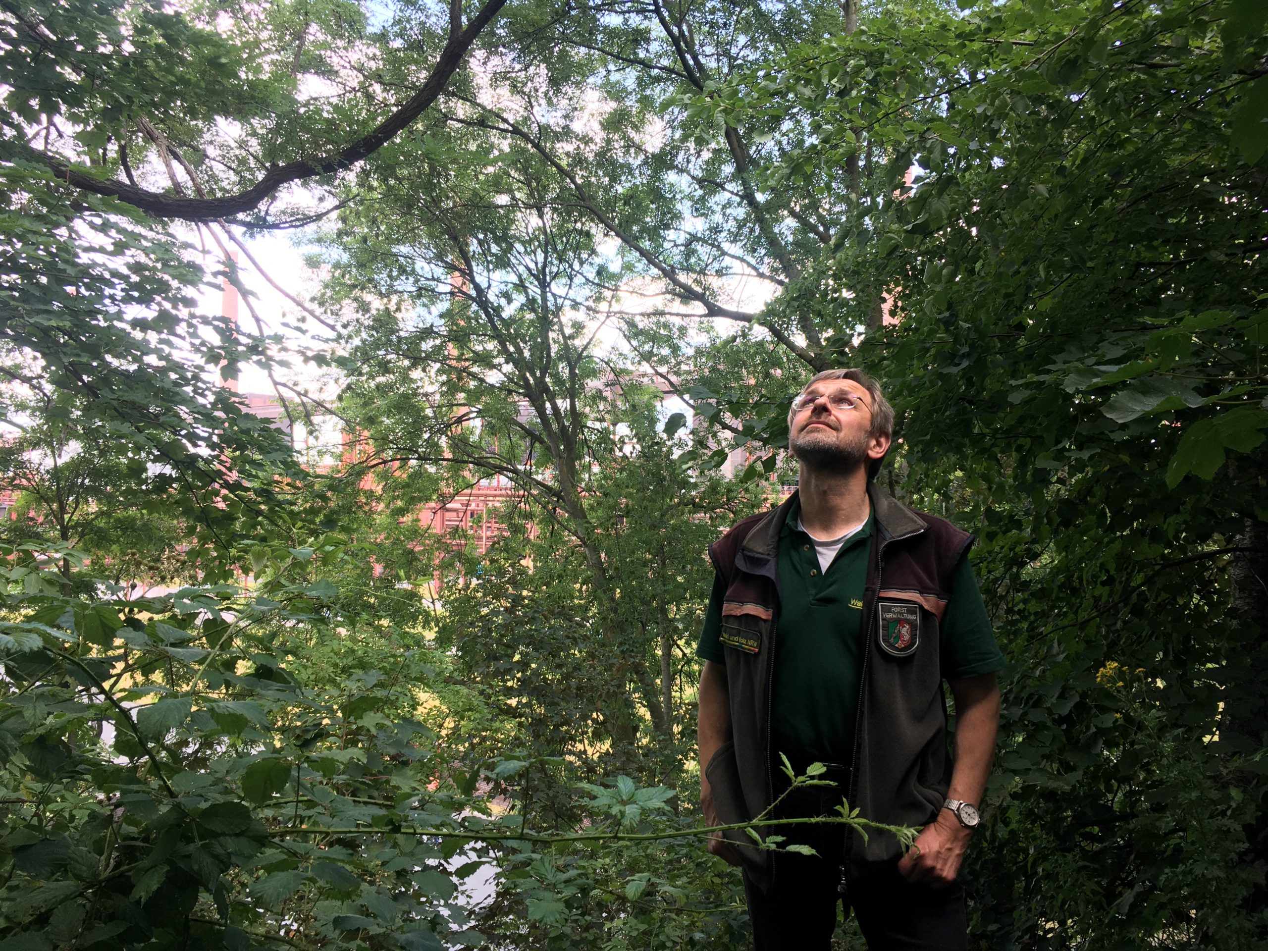 Hier, mitten in einem dichten Birkenwald aus sattgrünen Farben, verborgen im Skulpturenwald zwischen Zeche und Kokerei, ist Balkes Lieblingsplatz auf dem Welterbe. Ein Ort, an den sich sonst kaum ein Besucher verirrt. Oliver Balke aber kennt den Wald auf Zollverein so gut wie kaum ein anderer. Er ist Förster in fünfter Generation. Sein Vater war Stadtförster in Bochum, der Großvater Förster in Pommern. Den außergewöhnlichsten Förster-Job hat aber wohl Oliver Balke selbst: „Zechenförster“ wird er von den Kolleginnen und Kollegen genannt. Er ist der einzige Förster, der ausschließlich Industriebrachen betreut. Seit mehr als 25 Jahren ist der Leiter der Forststation Rheinelbe immer wieder auch auf dem Welterbe unterwegs. Er betreut das im Rahmen der IBA entstandene Projekt „Industriewald Ruhrgebiet“.