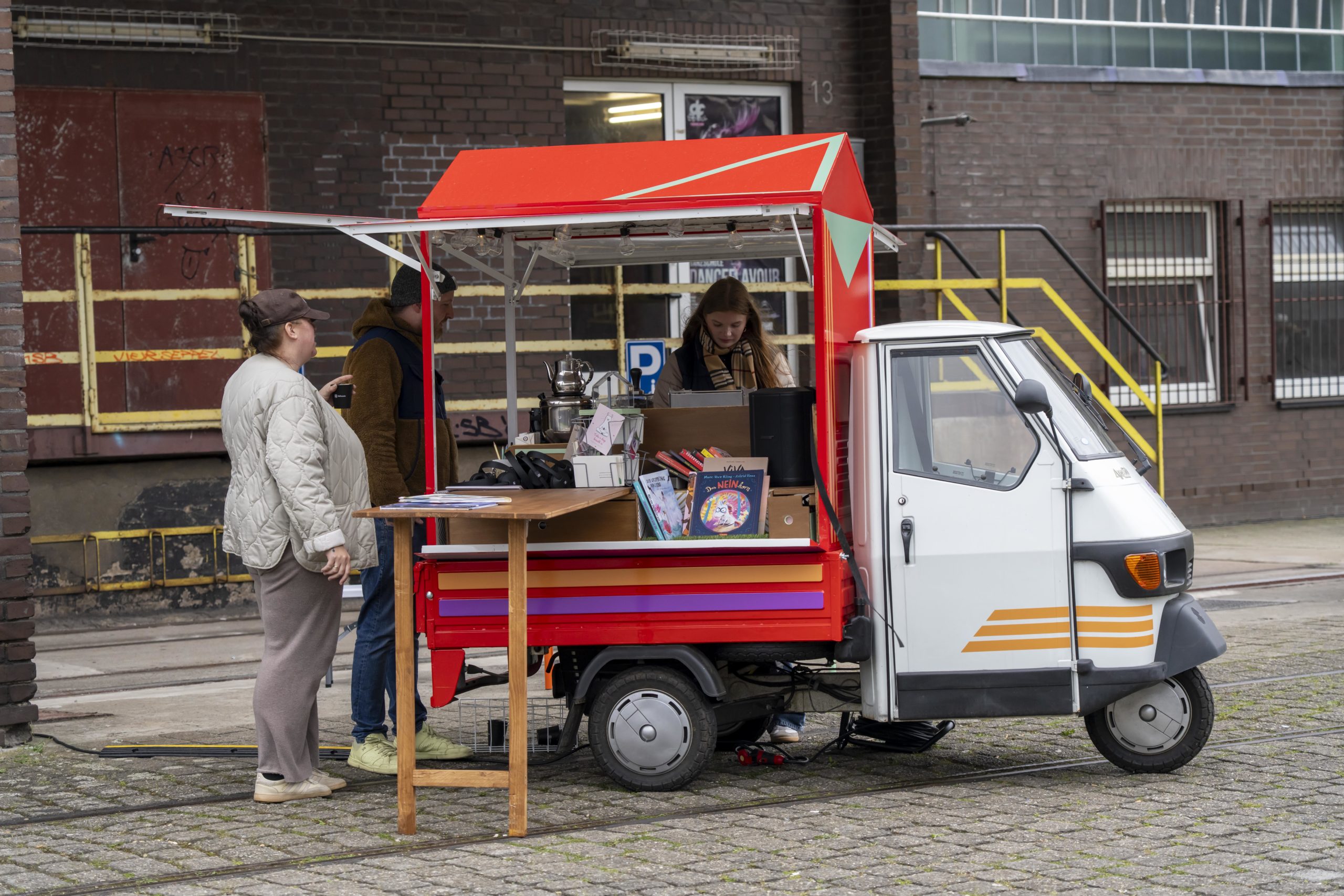 Für die Kunst- und Kultur-Projekte auf Zollverein gilt grundsätzlich: Die Vielfalt der Gesellschaft soll sich im Publikum und in den mitwirkenden Künstlerinnen und Künstlern widerspiegeln. „Wir laden dazu ein, an den Kunst- und Kulturprojekten teilzuhaben, mitzugestalten“, sagt Carola Bühn. „Dafür suchen wir verstärkt das Gespräch mit Besucherinnen und Besuchern sowie Bewohnerinnen und Bewohnern.“ Zum Beispiel dann, wenn EZRA vorfährt. Ausgestattet mit Espressobar, Sitzgelegenheiten, Büchern, Staffeleien, Spielen und einer DJ-Anlage schaff t die fahrende mobile Kunstinstallation, eine umgestaltete alte Dreirad-Vespa, einen Ort des Austauschs und der Begegnung. Die mobile Gefährtin kommt erstmals im Rahmen der Saisoneröffnung am 30. März zum Einsatz und begleitet künftig einzelne Kulturveranstaltungen. Auch zu anderen Ereignissen auf dem Welterbe-Gelände und im Stadtteil ist das Mobil unterwegs. „Mit EZRA sprechen wir eine Einladung, eine große Umarmung aus“, sagt Carola Bühn lächelnd.