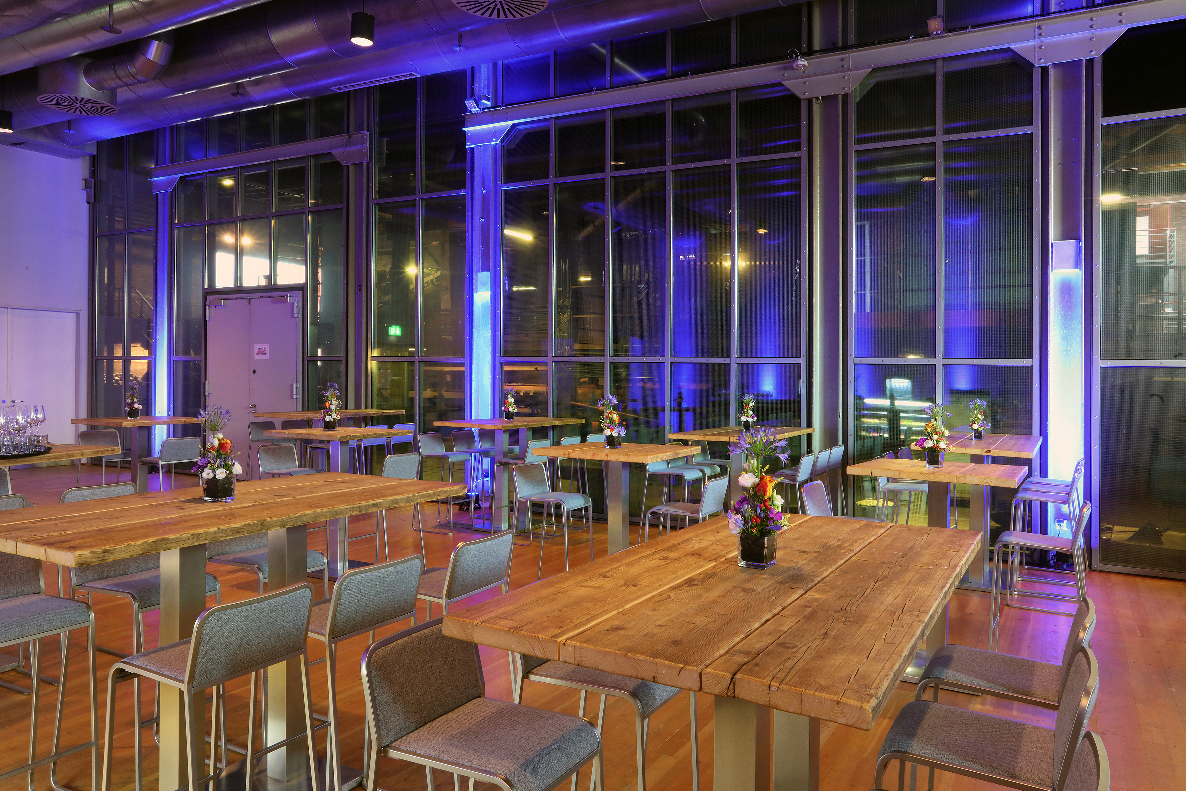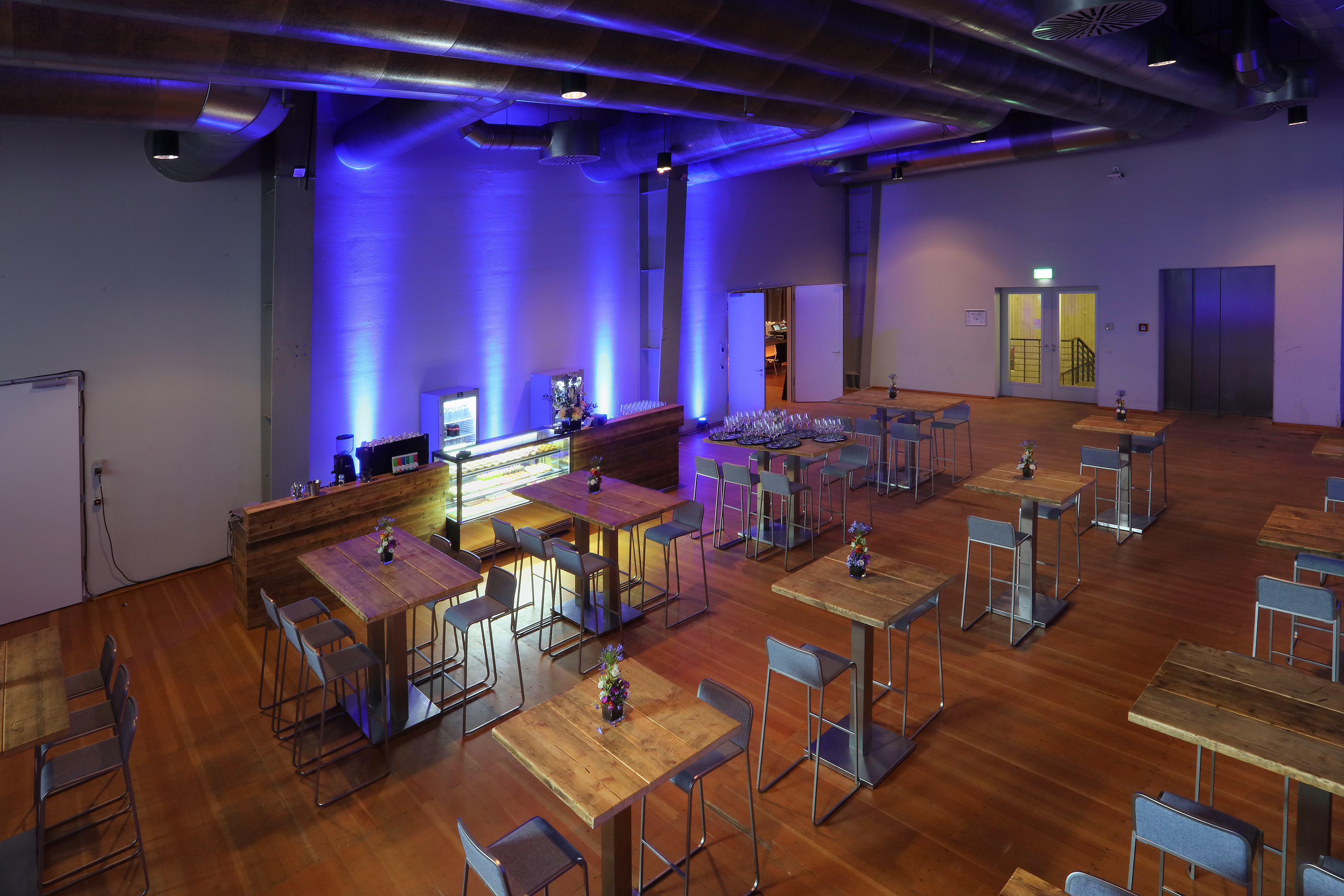 Im Rahmen der Umnutzung des Industriegeländes wurde der große Saal im Obergeschoss mit einem Traversensystem ausgestattet. Der Eingangsbereich im Erdgeschoss bietet mit einem Foyer, einem kleinen Saal und Break-Out-Rooms Raum für Garderoben, Backoffice oder Meetingbereiche. Künstlergarderoben stehen im Zwischengeschoss zur Verfügung. Für Empfänge eignet sich ein weiteres Foyer im Obergeschoss und überrascht mit einem Highlight: Durch eine Glaswand sind die historischen Produktionsanlagen sichtbar.