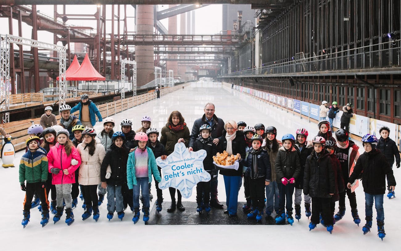 Essen. Spaß haben und den Wandel auf dem UNESCO-Welterbe Zollverein im wahrsten Sinne des Wortes „erfahren“ – diese Gelegenheit bot sich rund 600 Kindern aus neun Essener Schulen auf der Zollverein-Eisbahn. Möglich machte dies das gemeinsame Engagement der RAG-Stiftung sowie der Gesellschaft der Freunde und Förderer der Stiftung Zollverein e.V. Von Montag, 9., bis Dienstag, 17. Dezember 2024, kamen Kinder und Jugendliche zwischen acht und fünfzehn Jahren auf das Welterbe und drehten unter sportpädagogischer Anleitung kostenfrei ihre Runden auf dem Eis.