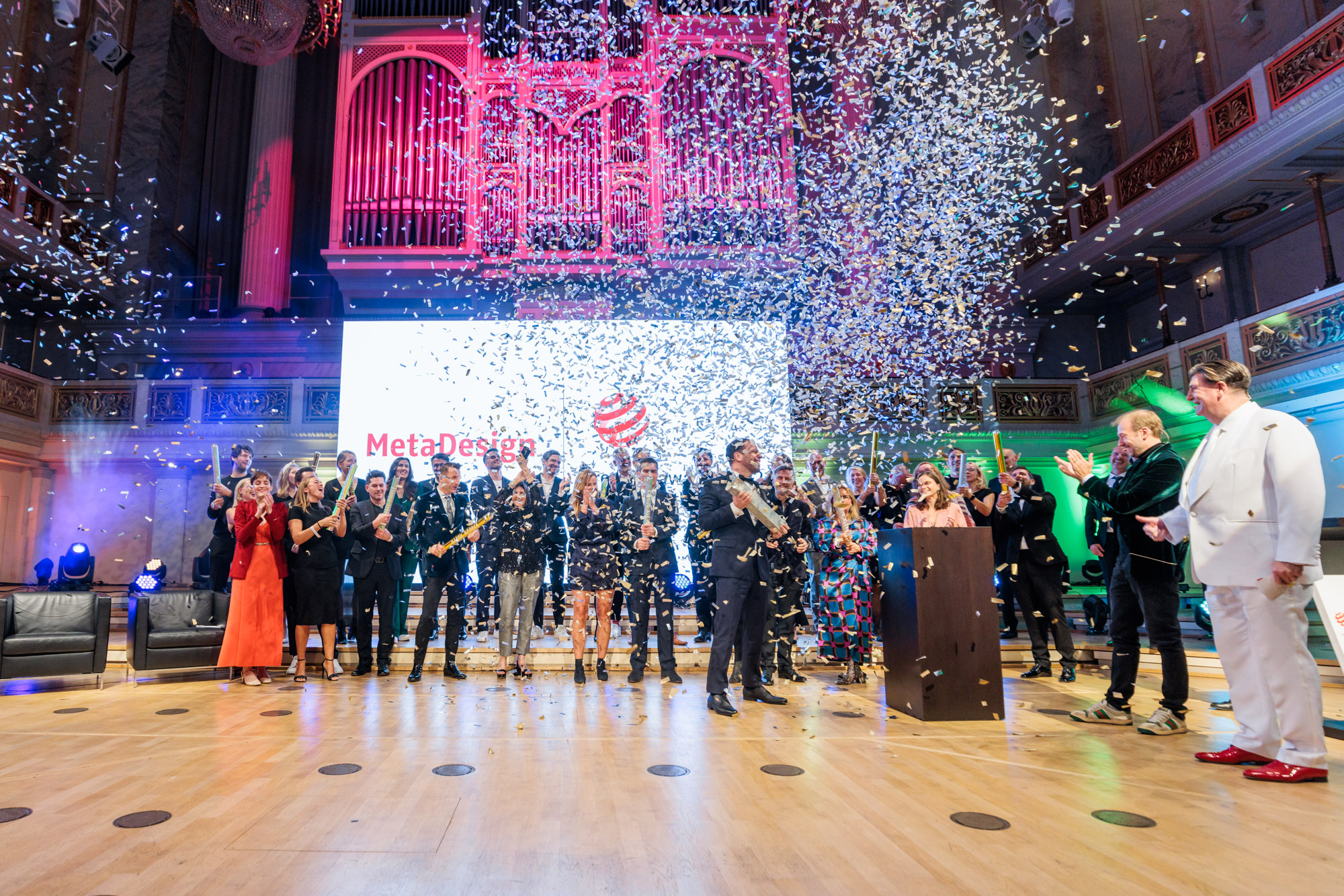 Große Gruppe festlich gekleideter Menschen auf einer Bühne in einem prunkvollen Saal, die jubelnd in die Kamera blicken und feiern. Im Hintergrund eine große Leinwand mit der Aufschrift MetaDesign und Red Dot Award 2022 – Agency of the Year, dazu das rote Red-Dot-Logo. Auf dem Boden liegen goldene und schwarze Konfettistreifen. Eine Person in der Mitte hält strahlend die Red-Dot-Trophäe in den Händen. Die Atmosphäre ist fröhlich, ausgelassen und festlich. scroll